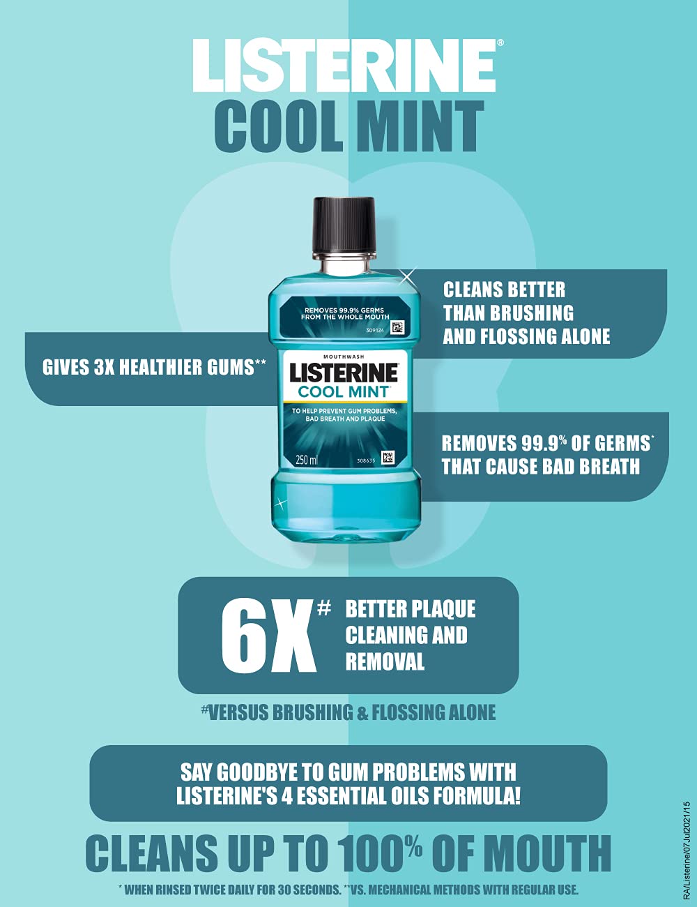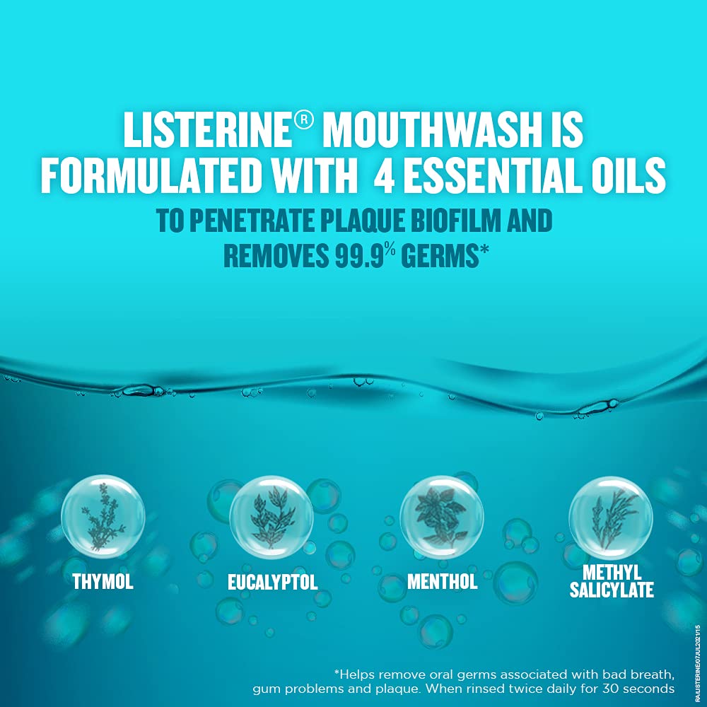 We brush our teeth everyday, but brusing cleans only our teeth. Other parts of the mouth like tongue, gums, palette (roof of the mouth) and inner side of the cheeks may not get cleaned. This may lead to germ build up in the mouth which causes various oral problems like bad breath, bleeding gums and cavities. Rinsing everyday with Listerine removes 99.9% germs from your mouth as it can reach every corner of your mouth. Our patented powerful essential oil formula (Menthol, Thymol, Eucalpytol, Oil of Wintergreen), provides upto 24 hour protection against germs causing bad breath, gum problems and plaque. For best results, rinse with undiluted 20ml twice a day for 30 seconds. Don?t worry if you can?t get to 30 seconds the first time, it gets easier with each try. Now get whole mouth clean with Listerine!