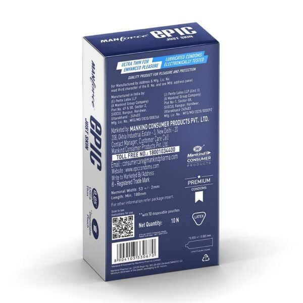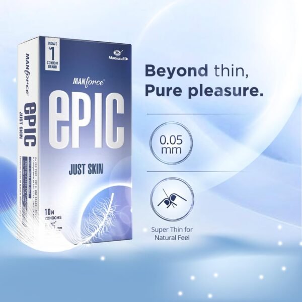 Experience closeness like never before with Manforce Epic Just Skin Condoms. Designed to give you the most natural skin-to-skin feel, these ultra-thin (0.05 mm) condoms ensure safety without compromising intimacy. Made with premium quality latex, dermatologically tested, and electronically verified, Epic Just Skin brings you a smooth, pleasurable, and worry-free experience. With discreet packaging, cruelty-free production, and adherence to international safety standards, Manforce Epic Just Skin Condoms are crafted to provide reliable protection, comfort, and pure connection.