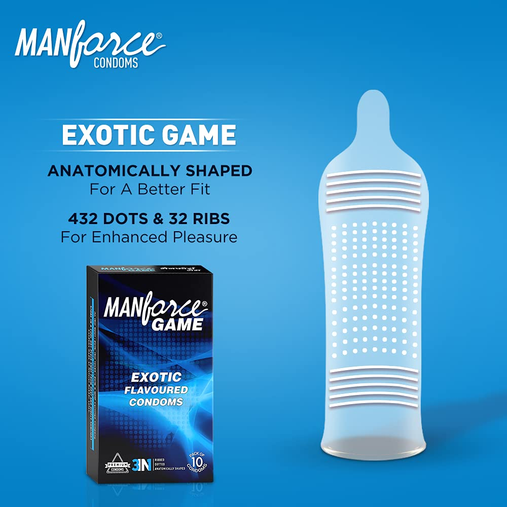 Discover the next level of pleasure with Manforce Game condoms. These condoms aren’t just about protection; they’re about intensifying your experience. Their unique design offers a snug, comfortable fit while the exotic flavour, ribbing and dots add a layer of excitement, turning every touch into an extraordinary sensation.These ISO-certified, high-quality condoms are designed to enhance pleasure while keeping you safe. The ribbed and dotted texture and extra lubrication maximise sensitivity, ensuring heightened sensations for you and your partner. These condoms are crafted from non-toxic, body-safe materials, providing a comfortable and reliable fit. With discreet packaging, you can explore your desires with privacy and confidence. Manforce condoms offer ultimate protection, preventing STDs and unwanted pregnancies. Their durability and reliable performance make them a trusted choice for safe and pleasurable intimacy.Choose Manforce, India’s No.1 condom brand, known for its commitment to sexual health. With Manforce Condoms for men, you can indulge in long-lasting pleasure and intimacy. Enjoy safe sex, enhanced pleasure, and intimate moments with Manforce Condoms, the trusted choice for sensual satisfaction.